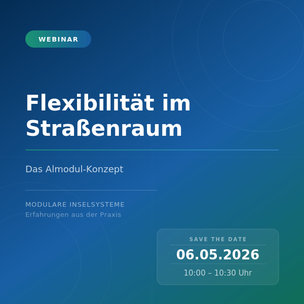 In unserem Webinar „Flexibilität im Straßenraum: Das Almodul-Konzept“ zeigen wir, wie modulare Lösungen neue Spielräume in der Verkehrsberuhigung eröffnen.