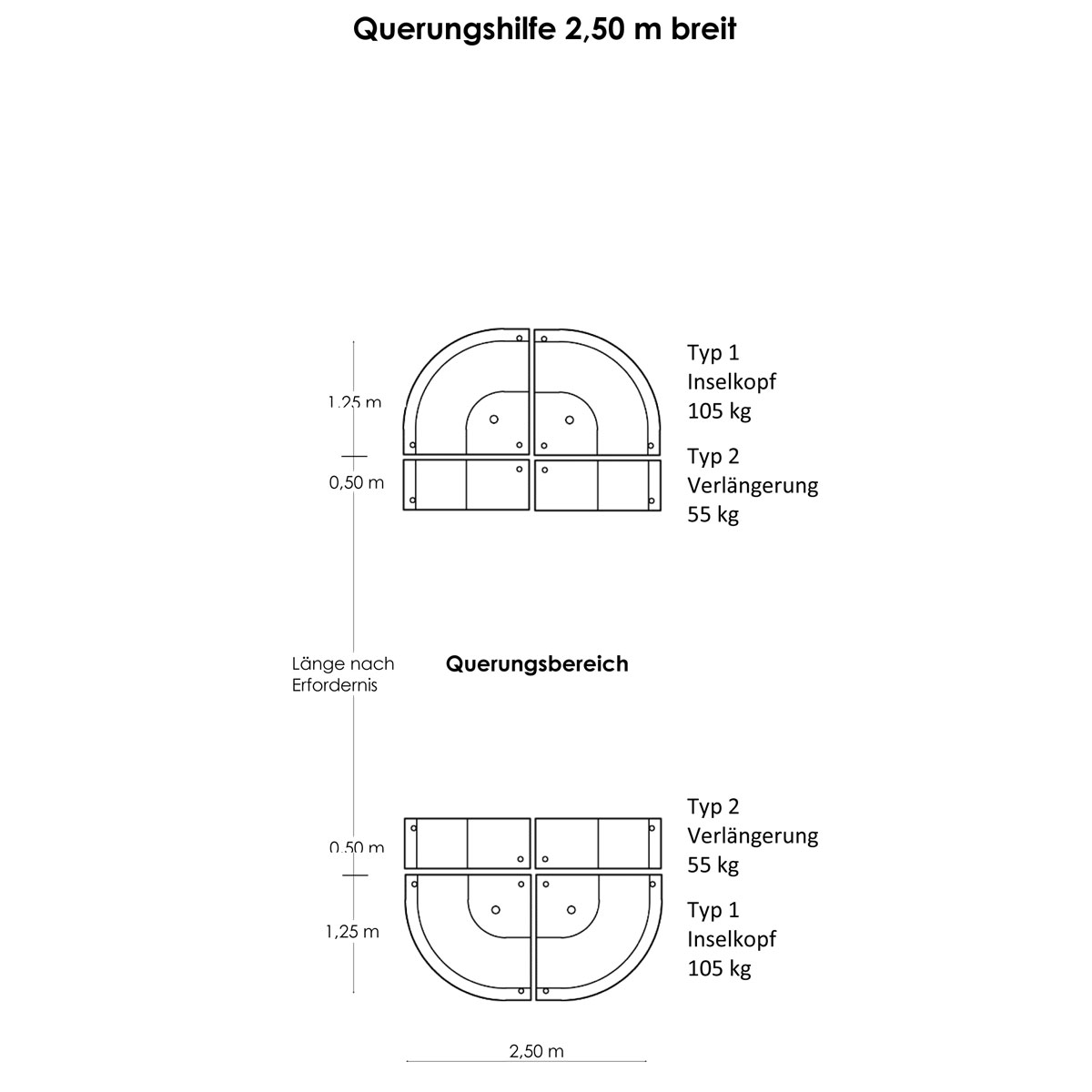 Es bietet standardmäßig die empfohlene Mindestbreite von 2,50 m für Querungshilfen, die neben Fußgängern auch von Radfahrenden genutzt werden – komfortabel, sicher und benutzerfreundlich!